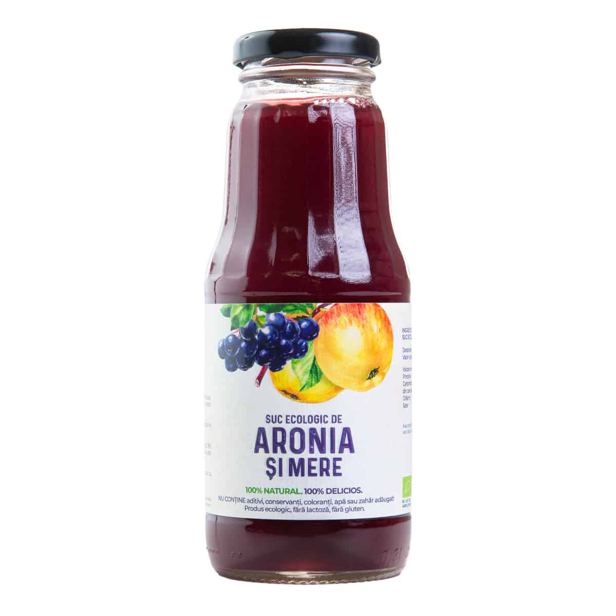 Suc ecologic de Aronia și Măr Cauți o alternativă sănătoasă și gustoasă pentru sucurile din comerț? Atunci sucul de aronia cu măr este alegerea perfectă pentru tine. Este un suc 100% natural și ecologic, obținut prin presare la rece, care nu conține aditivi, conservanți, zahăr sau coloranți. Nu conține nici apă sau alte arome, fiind o adevărată doză de sănătate și prospețime. Totodată, este un produs vegan — fără lactoză sau gluten — și este acreditat ecologic de AustriaBioGrantie, cel mai important Organism de Inspecție și Certificare din Austria. Beneficii pentru sănătate Sucul din fructe de aronia și măr este bogat în vitamine, minerale și antioxidanți care au numeroase beneficii pentru sănătatea celor mici și celor mari. Vorbim de vitamine precum A, C, E, K, P, Q și de minerale precum calciu, zinc, fier, folati, potasiu, magneziu și mangan. În plus, fructele de aronia au un nivel mai ridicat de antioxidanți decât merișoarele sau afinele. Datorită acestui mix de sănătate, sucul de aronia: – Contribuie la tratarea cancerului esofagian și de colon