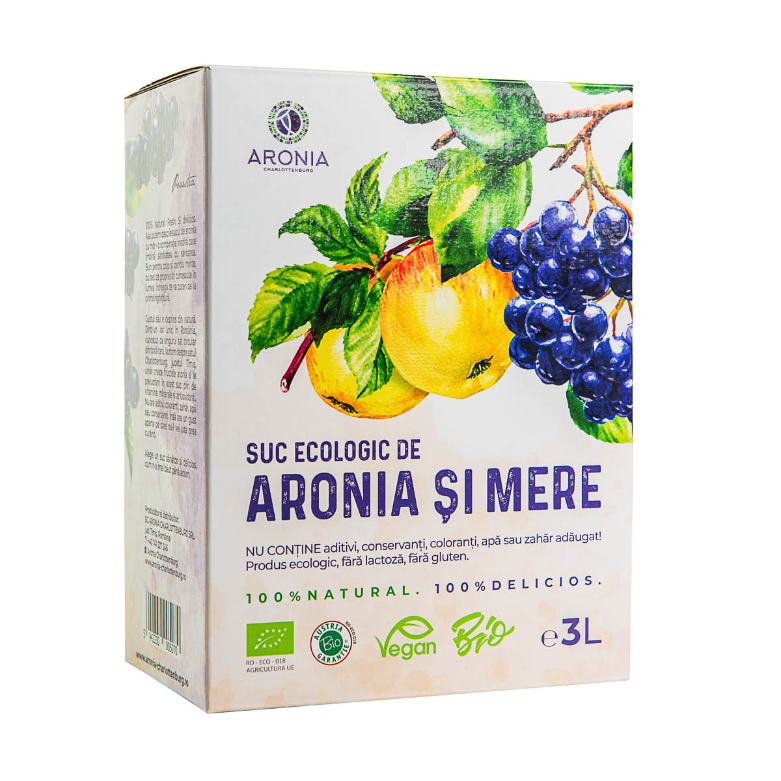 Suc ecologic de Aronia și Măr Cauți o alternativă sănătoasă și gustoasă pentru sucurile din comerț? Atunci sucul de aronia cu măr este alegerea perfectă pentru tine. Este un suc 100% natural și ecologic, obținut prin presare la rece, care nu conține aditivi, conservanți, zahăr sau coloranți. Nu conține nici apă sau alte arome, fiind o adevărată doză de sănătate și prospețime. Totodată, este un produs vegan — fără lactoză sau gluten — și este acreditat ecologic de AustriaBioGrantie, cel mai important Organism de Inspecție și Certificare din Austria. Beneficii pentru sănătate Sucul din fructe de aronia și măr este bogat în vitamine, minerale și antioxidanți care au numeroase beneficii pentru sănătatea celor mici și celor mari. Vorbim de vitamine precum A, C, E, K, P, Q și de minerale precum calciu, zinc, fier, folati, potasiu, magneziu și mangan. În plus, fructele de aronia au un nivel mai ridicat de antioxidanți decât merișoarele sau afinele. Datorită acestui mix de sănătate, sucul de aronia: – Contribuie la tratarea cancerului esofagian și de colon